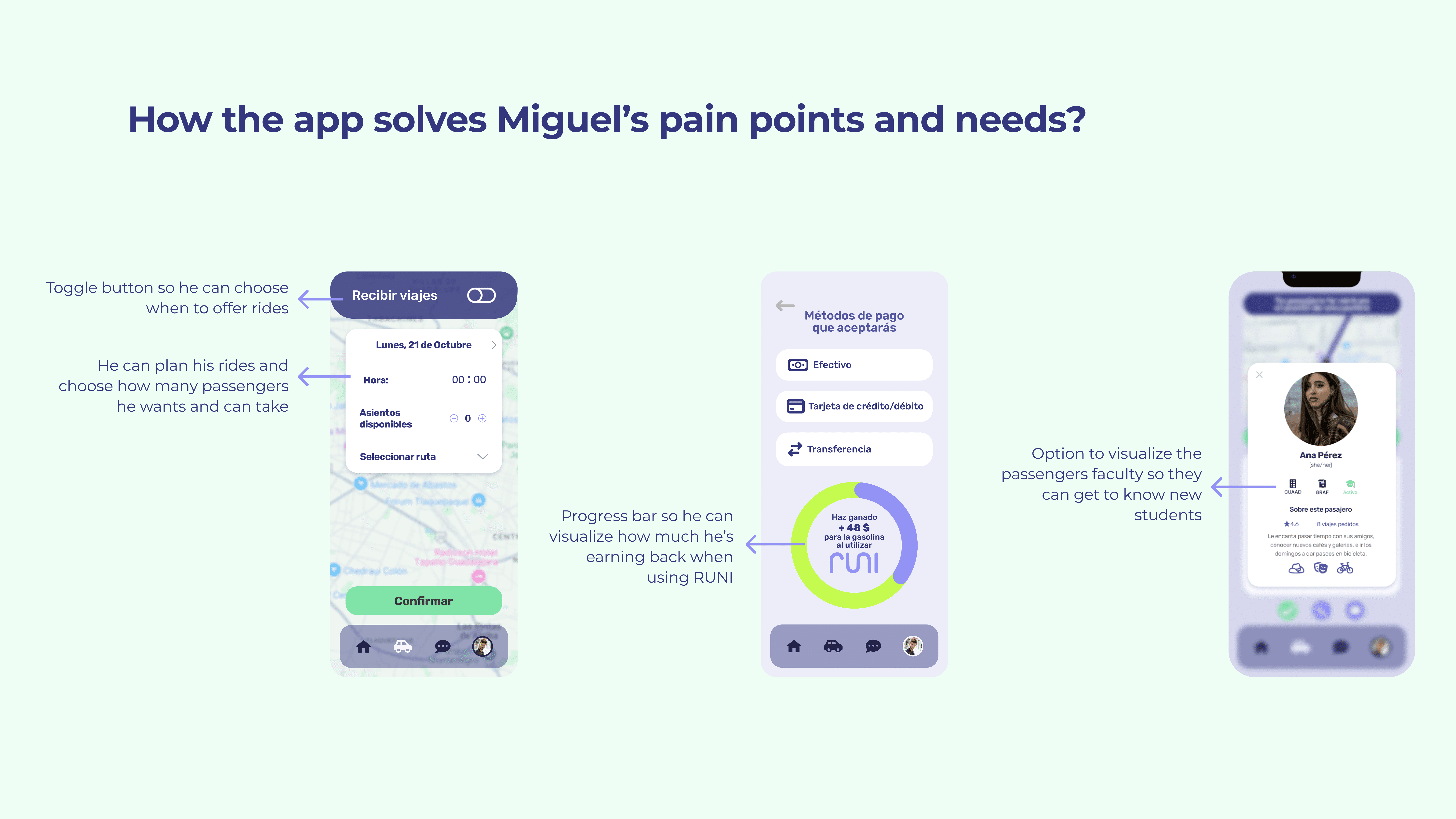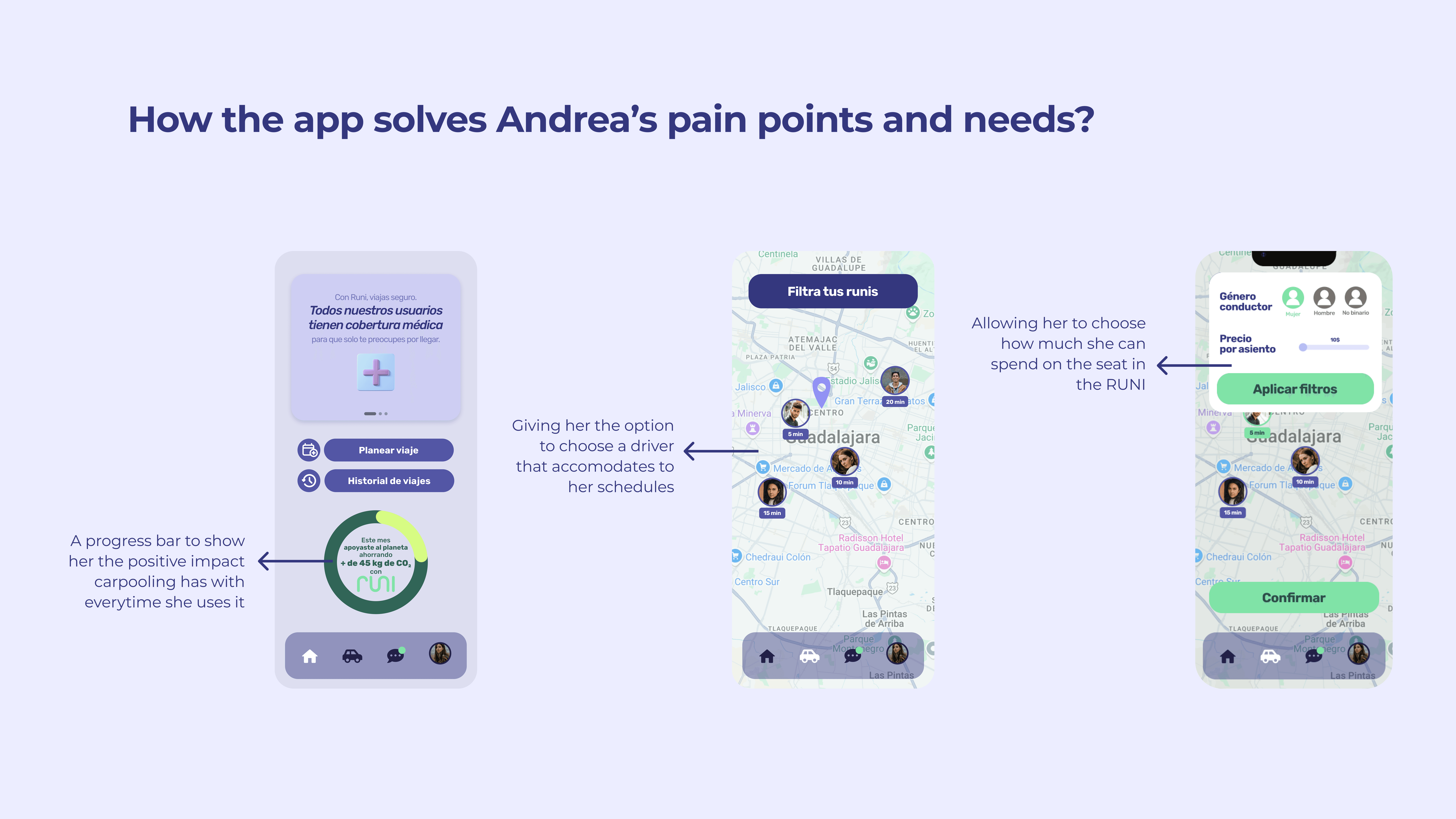 The previous exhaustive research phase highlighted the need for more safe, accesible and collaborative transportation solutions, leading to the development of detailed user personas representing the app's target audience.